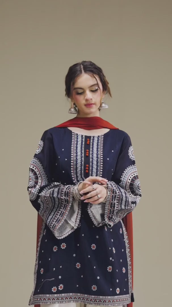 Make a bold statement with Rangrez – a stunning 3-piece stitched ensemble designed to blend elegance with tradition. Featuring intricate embroidery and a soft printed Monaar dupatta, this outfit is perfect for festive wear, formal gatherings, or Eid celebrations. ✨